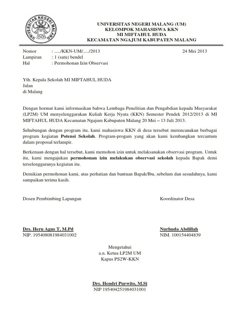 Demikian surat izin observasi ini kami buat. Atas perhatian dan kerjasama Bapak/Ibu, kami ucapkan terima kasih.